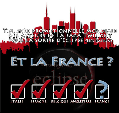 Cette année donc, la plupart des pays qui recevront l'équipe du film le fera pour la première fois, à l'exception de l'Angleterre, le pays de Robert Pattinson, ou de l'Italie, où ont eu lieu plusieurs séquences de tournage. Mais la France reste un des pays favoris des acteurs et des producteurs ! C'est la raison pour laquelle nous travaillons déjà à la venue des acteurs en France pour la sortie de Twilight - Chapitre 4. Enfin, parce que nous avons entendu vos souhaits, nous travaillons déjà à une rencontre publique à cette occasion, de sorte que les fans puissent rencontrer les acteurs.